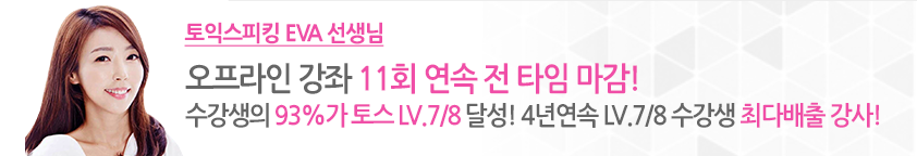 4년 연속 강남지역 Lv7,8 최다배출 강사! 오프라인강의 11회 연속 전 타임마감! 에바 토익스피킹 현장강의를 온라인으로 만나보세요